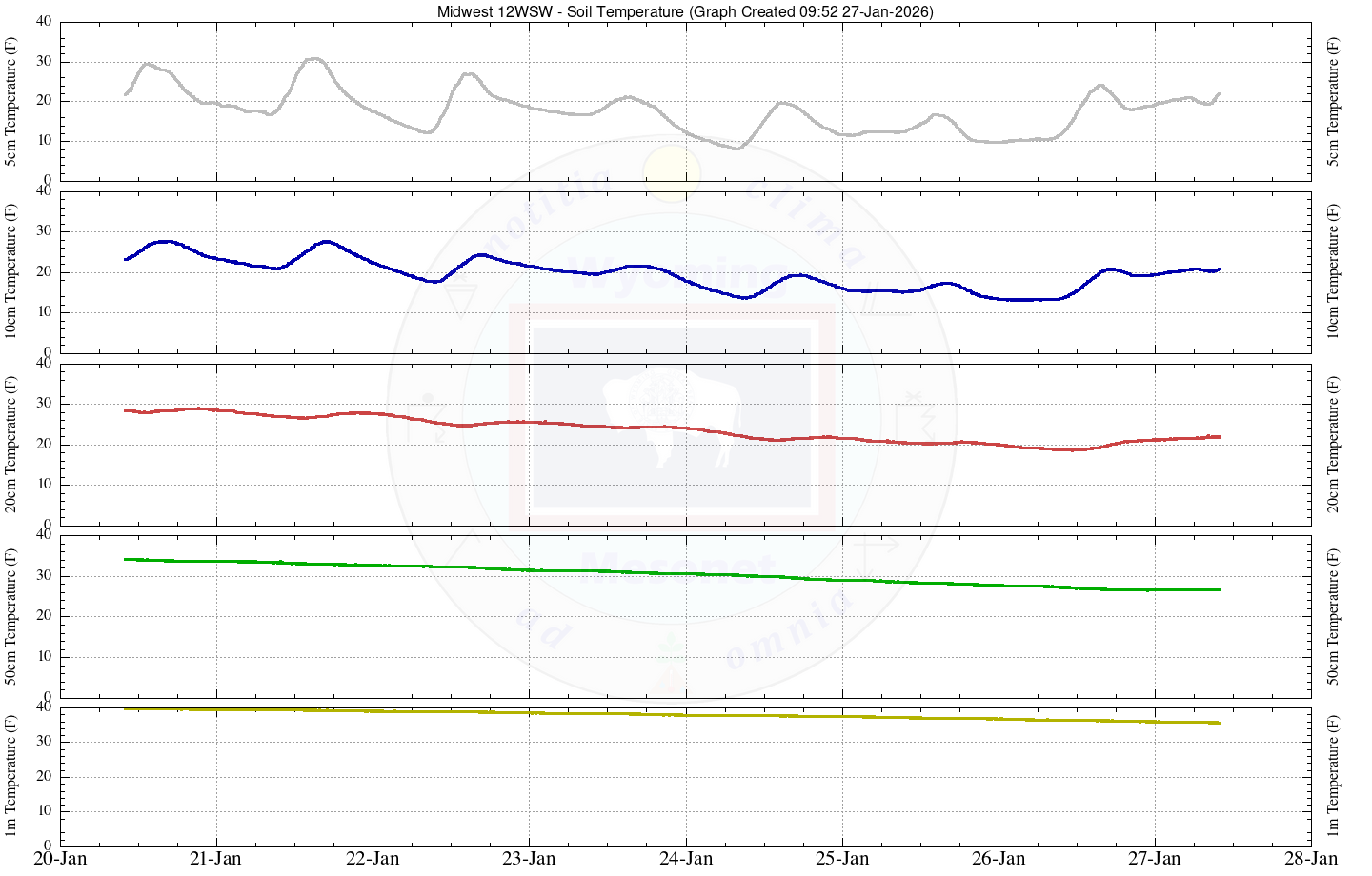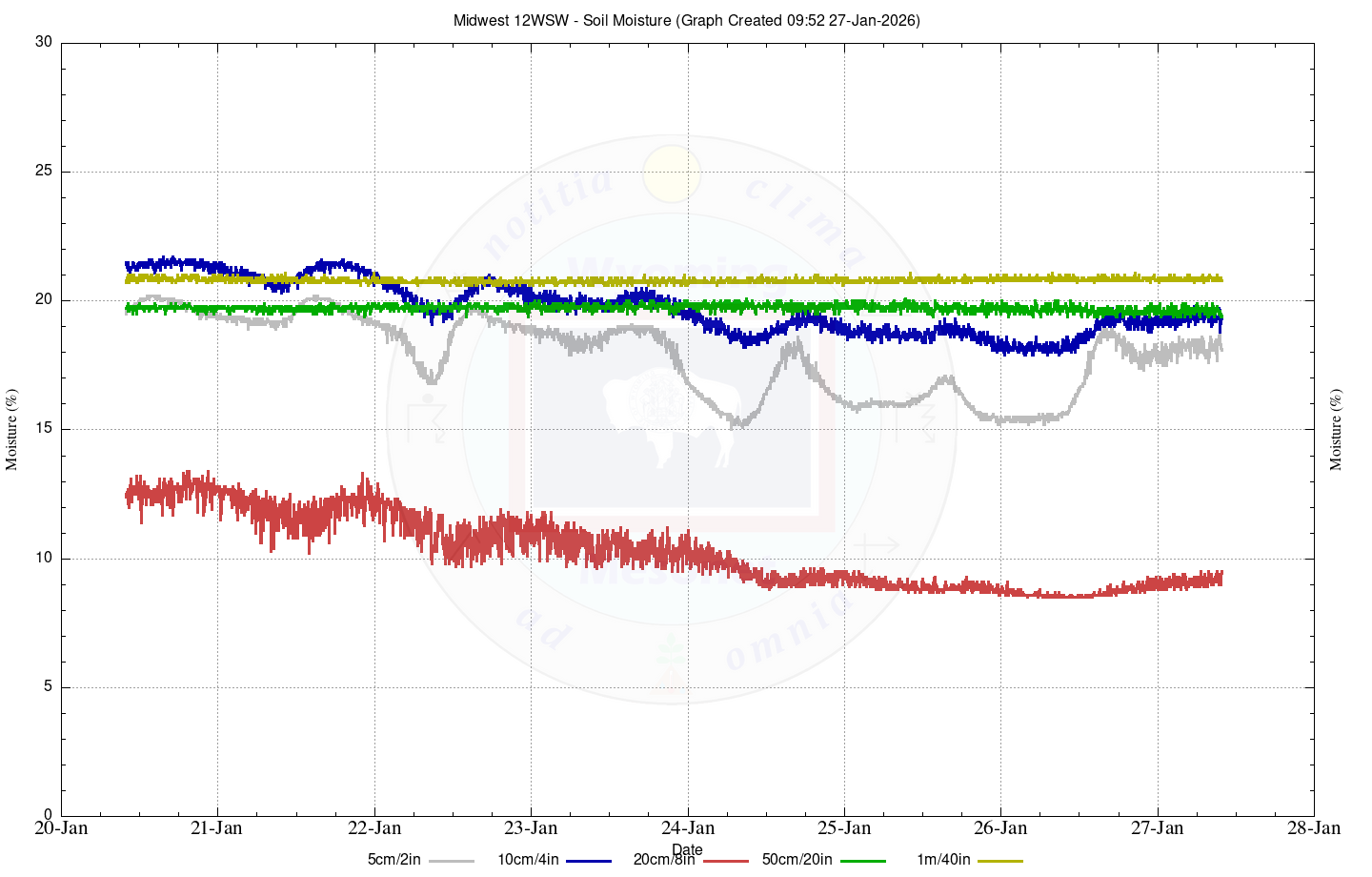 | Temp | Precip | Speed | Dir | Gust | Dir | Humidity | Pressure | Solar | Snow | Temperature (Deg F) | Moisture (%) | |||||||||