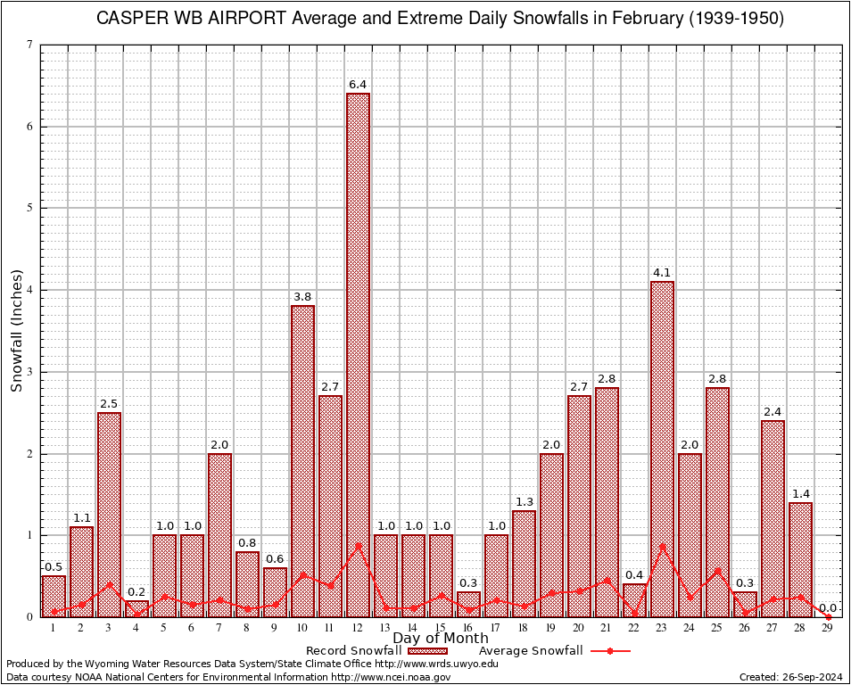February Average and Extreme Daily Snowfall AMounts (1939-1950)