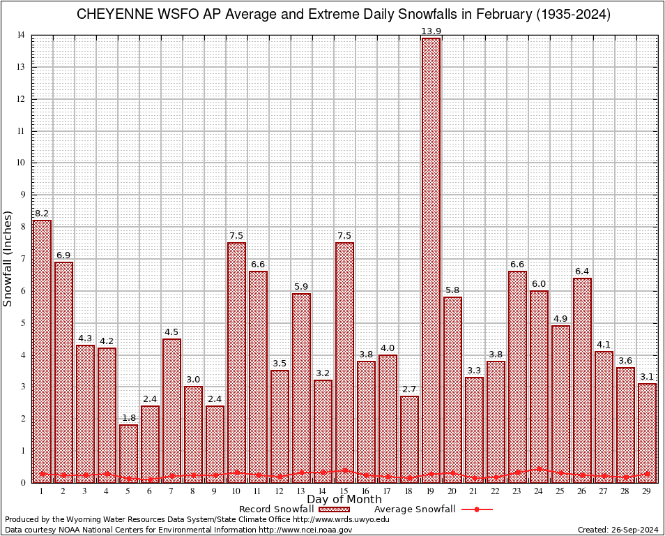 February Average and Extreme Daily Snowfall AMounts (1935-2024)