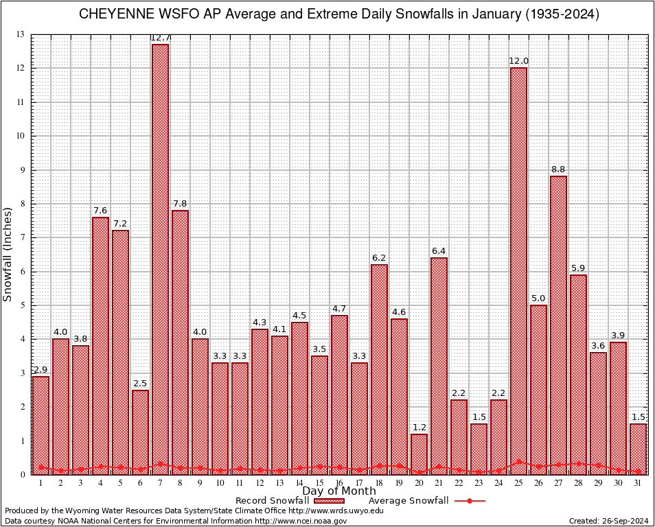 January Average and Extreme Daily Snowfall AMounts (1935-2024)