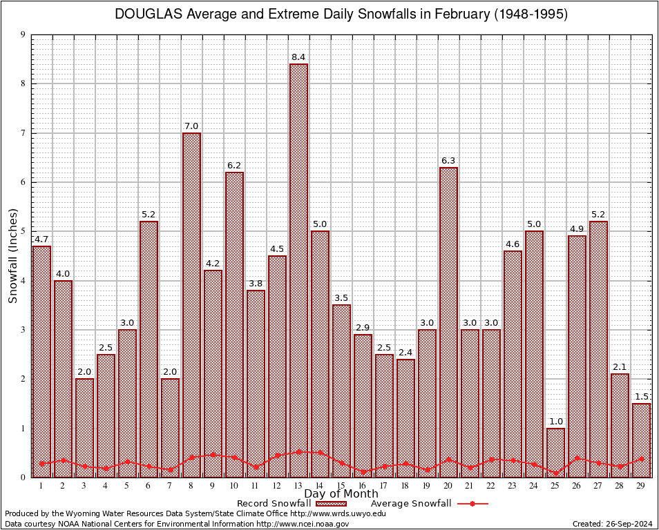 DOUGLAS (24019) February Average and Extreme Daily Snowfall AMounts (1948-1995) To index page for DOUGLAS