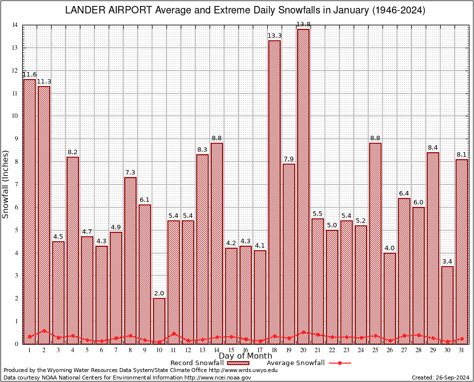 January Average and Extreme Daily Snowfall AMounts (1946-2024)