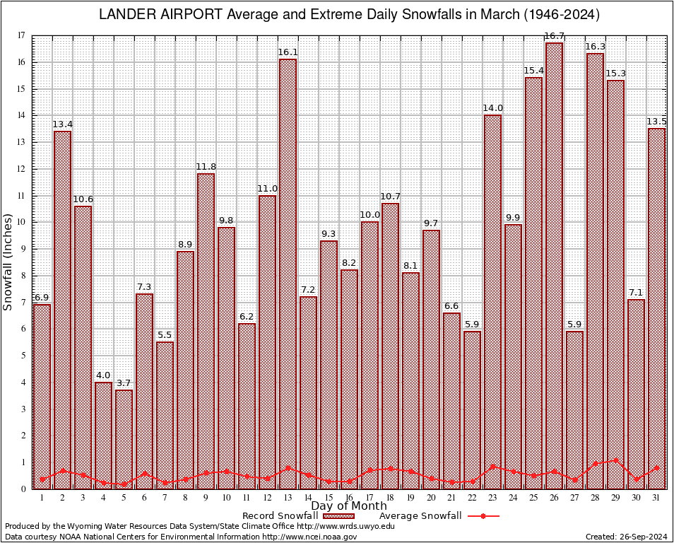 March Average and Extreme Daily Snowfall AMounts (1946-2024)