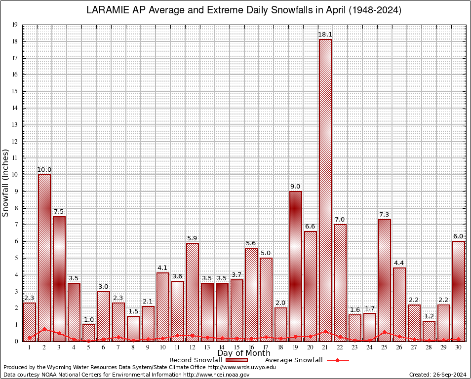 April Average and Extreme Daily Snowfall AMounts (1948-2024)