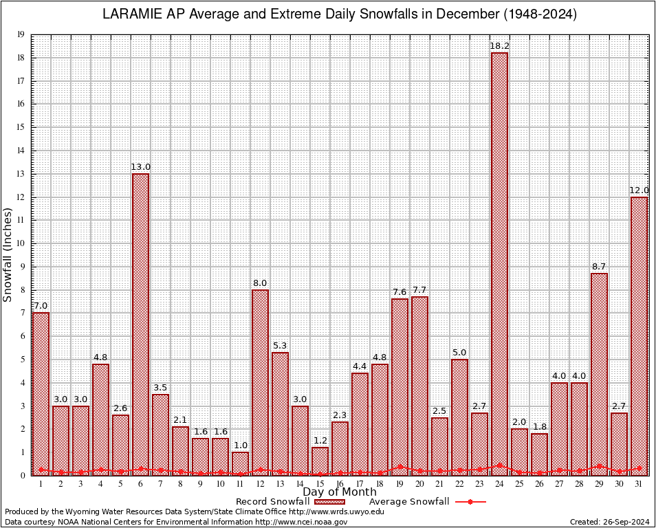 December Average and Extreme Daily Snowfall AMounts (1948-2024)