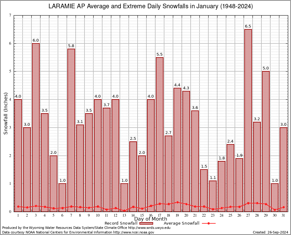January Average and Extreme Daily Snowfall AMounts (1948-2024)