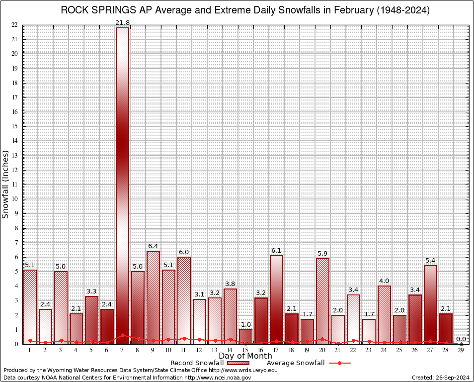 February Average and Extreme Daily Snowfall AMounts (1948-2024)