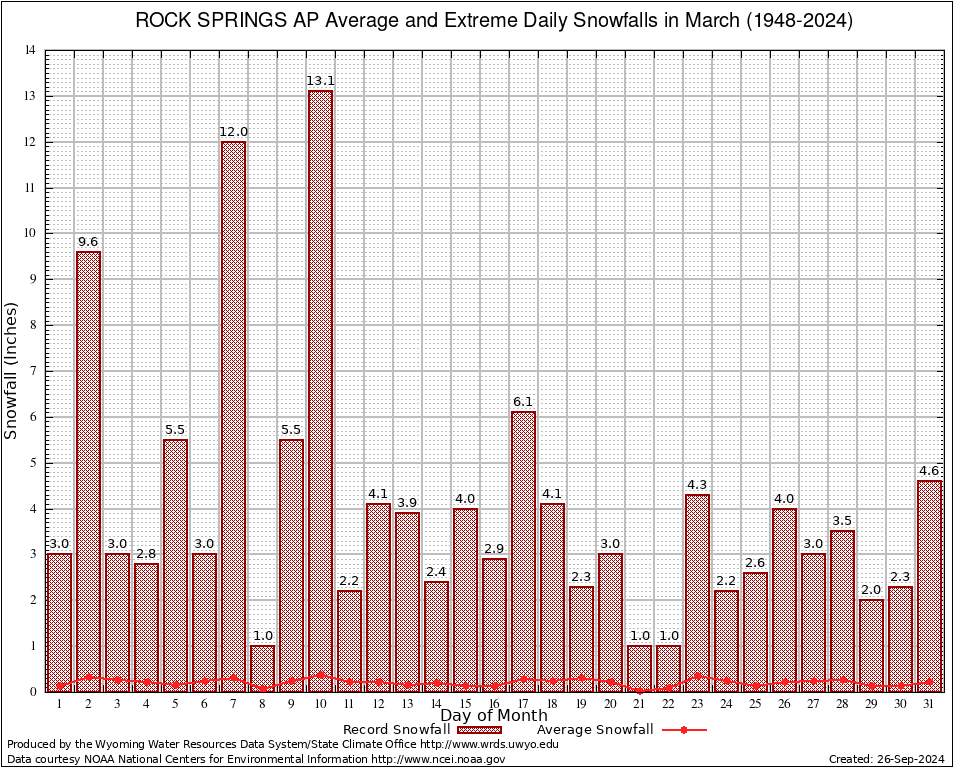 March Average and Extreme Daily Snowfall AMounts (1948-2024)