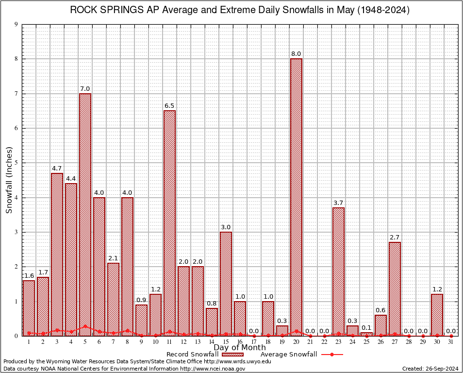 May Average and Extreme Daily Snowfall AMounts (1948-2024)