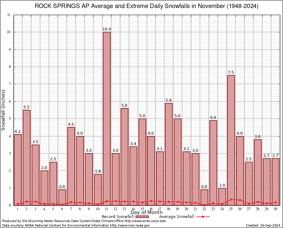 November Average and Extreme Daily Snowfall AMounts (1948-2024)