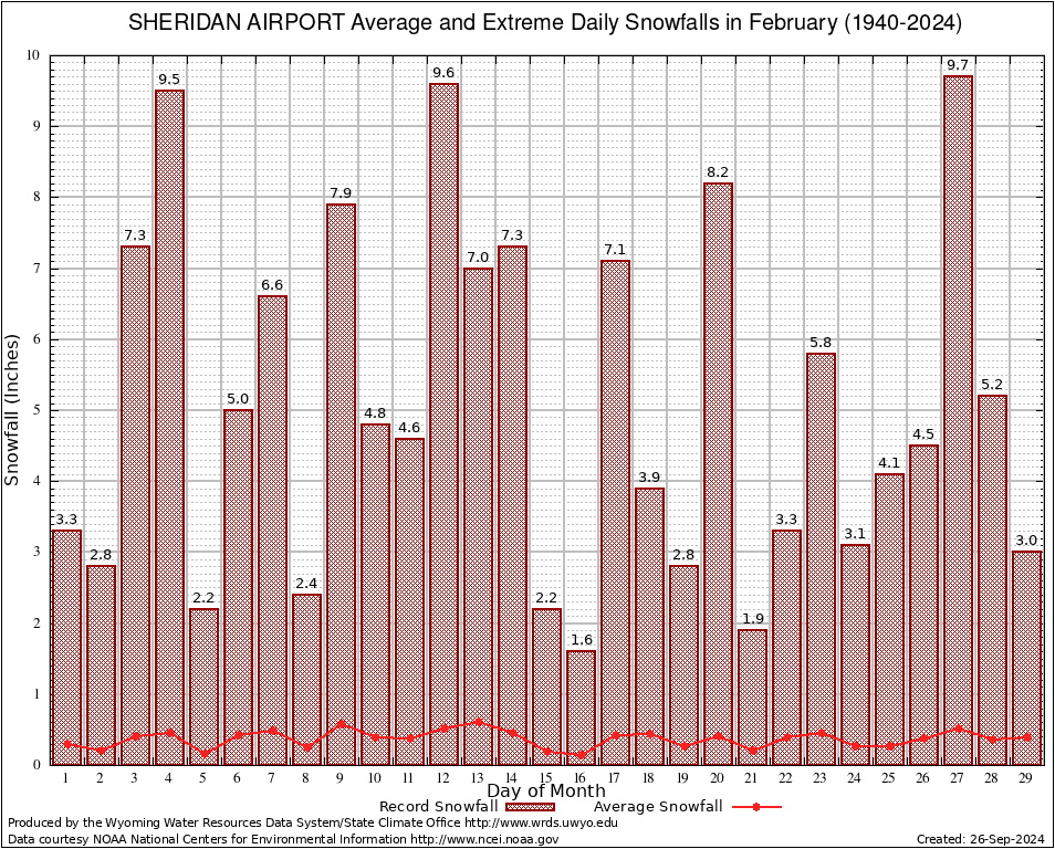 February Average and Extreme Daily Snowfall AMounts (1940-2024)