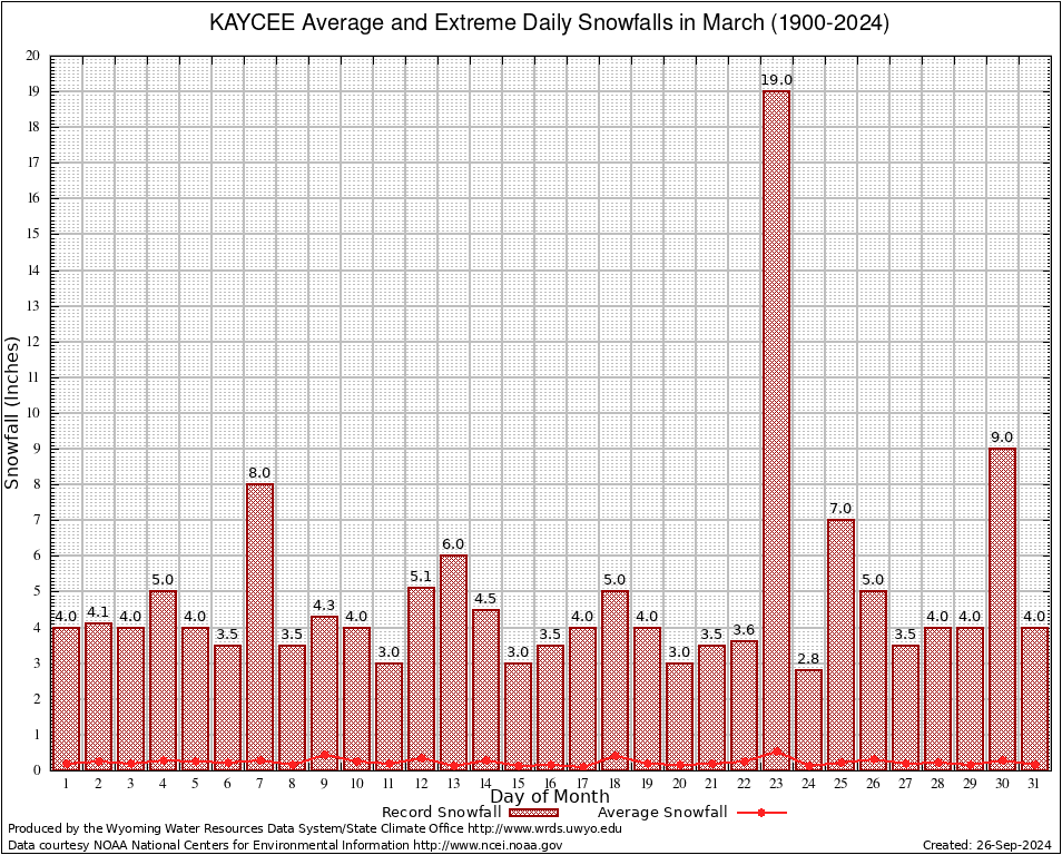 KAYCEE (24049) March Average and Extreme Daily Snowfall AMounts (1900-2024) To index page for KAYCEE