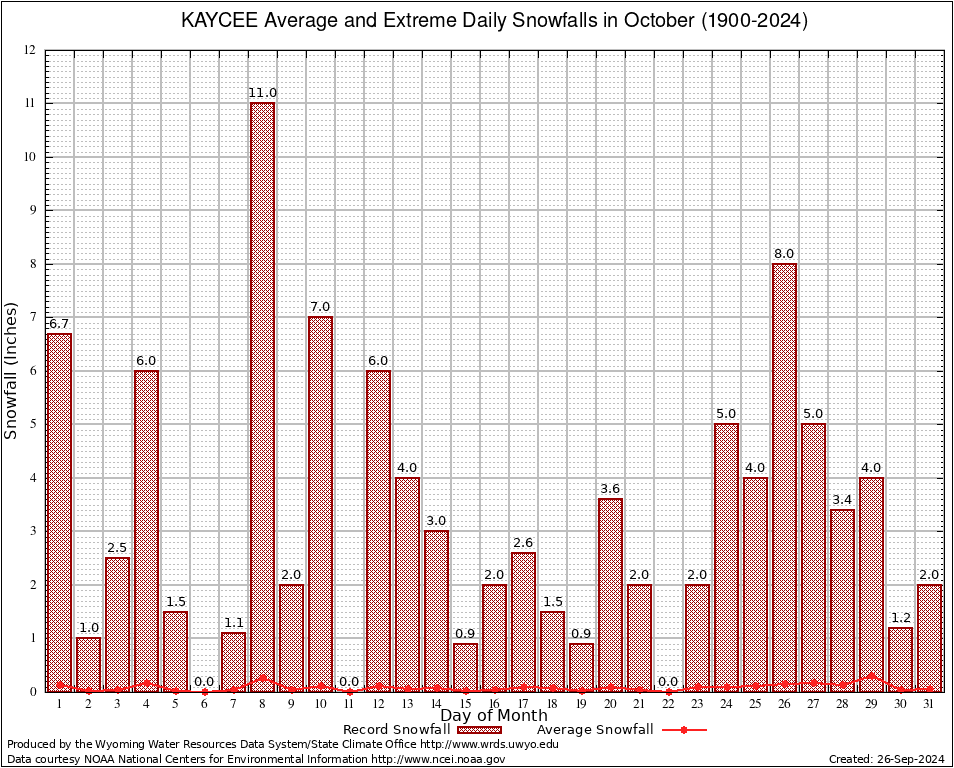 KAYCEE (24049) October Average and Extreme Daily Snowfall AMounts (1900-2024) To index page for KAYCEE
