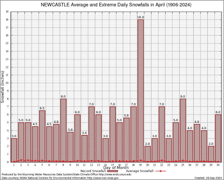 April Average and Extreme Daily Snowfall AMounts (1906-2024)
