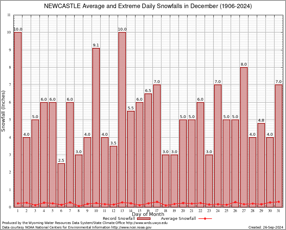 NEWCASTLE (24054) December Average and Extreme Daily Snowfall AMounts (1906-2024) To index page for NEWCASTLE