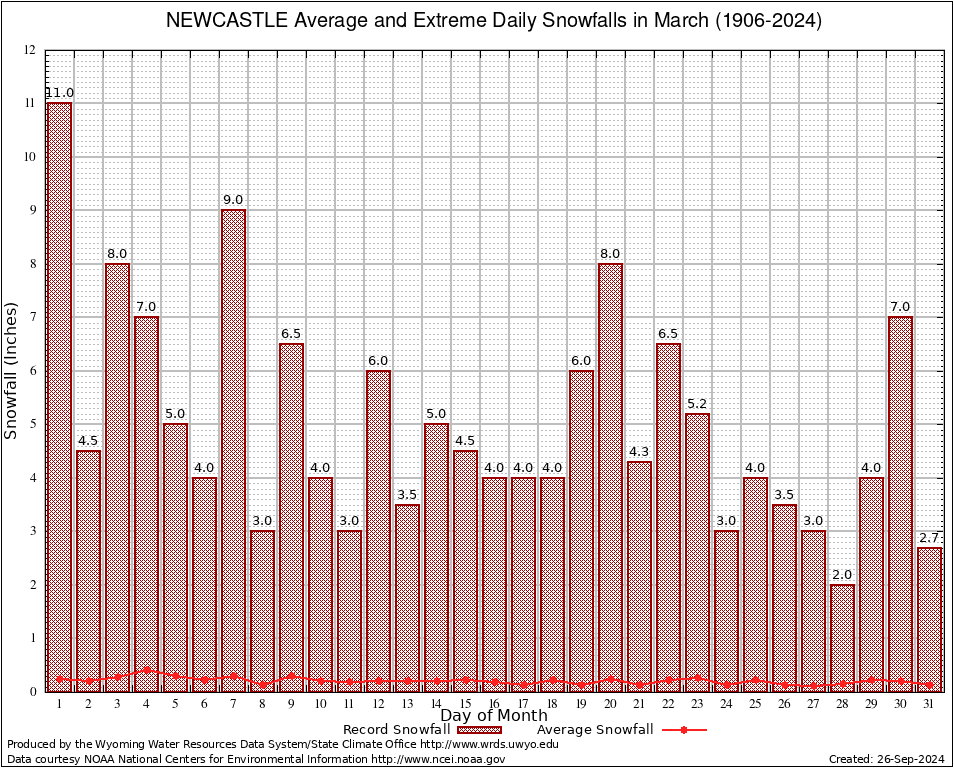 March Average and Extreme Daily Snowfall AMounts (1906-2024)