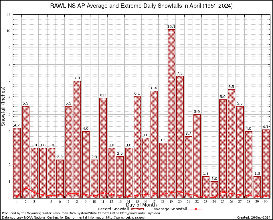 April Average and Extreme Daily Snowfall AMounts (1951-2024)