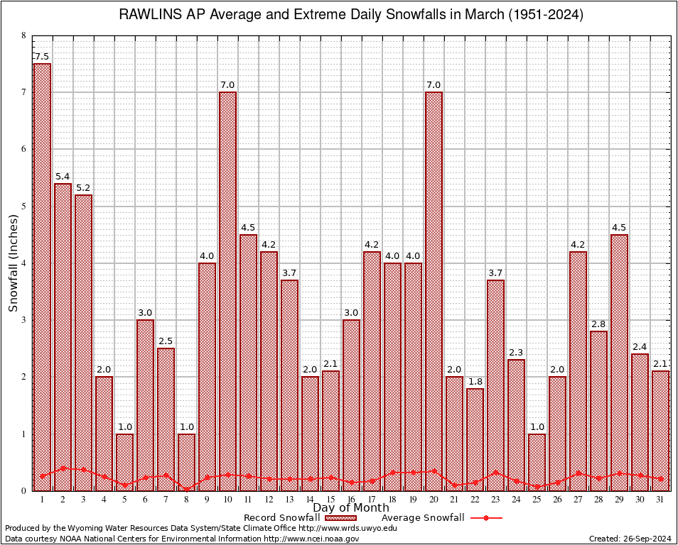 March Average and Extreme Daily Snowfall AMounts (1951-2024)