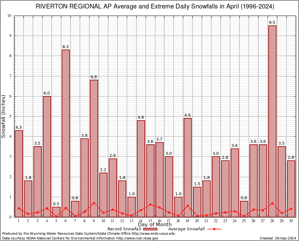 April Average and Extreme Daily Snowfall AMounts (1996-2024)