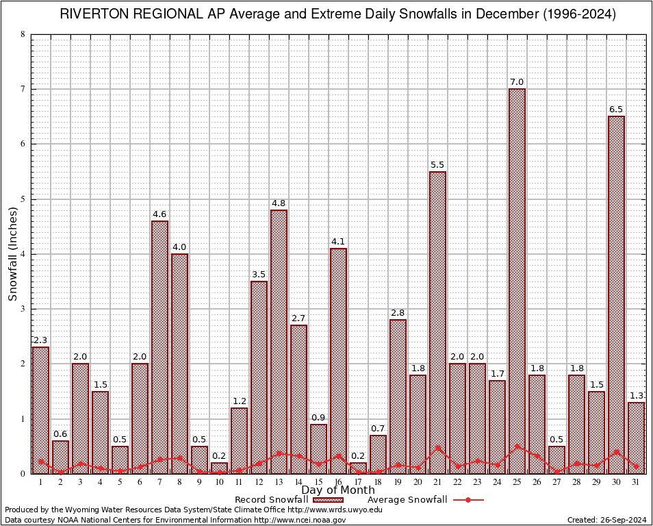 December Average and Extreme Daily Snowfall AMounts (1996-2024)