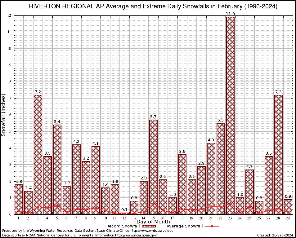 February Average and Extreme Daily Snowfall AMounts (1996-2024)