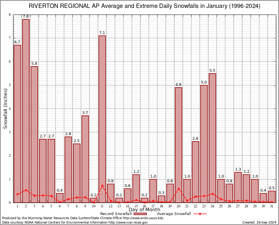 January Average and Extreme Daily Snowfall AMounts (1996-2024)