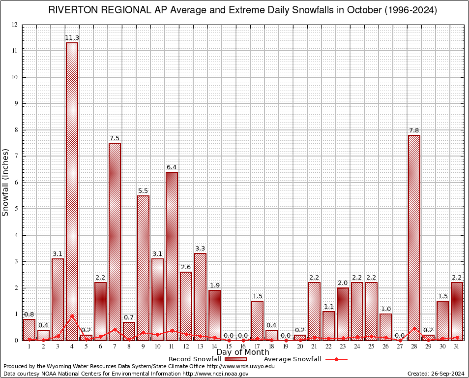 October Average and Extreme Daily Snowfall AMounts (1996-2024)