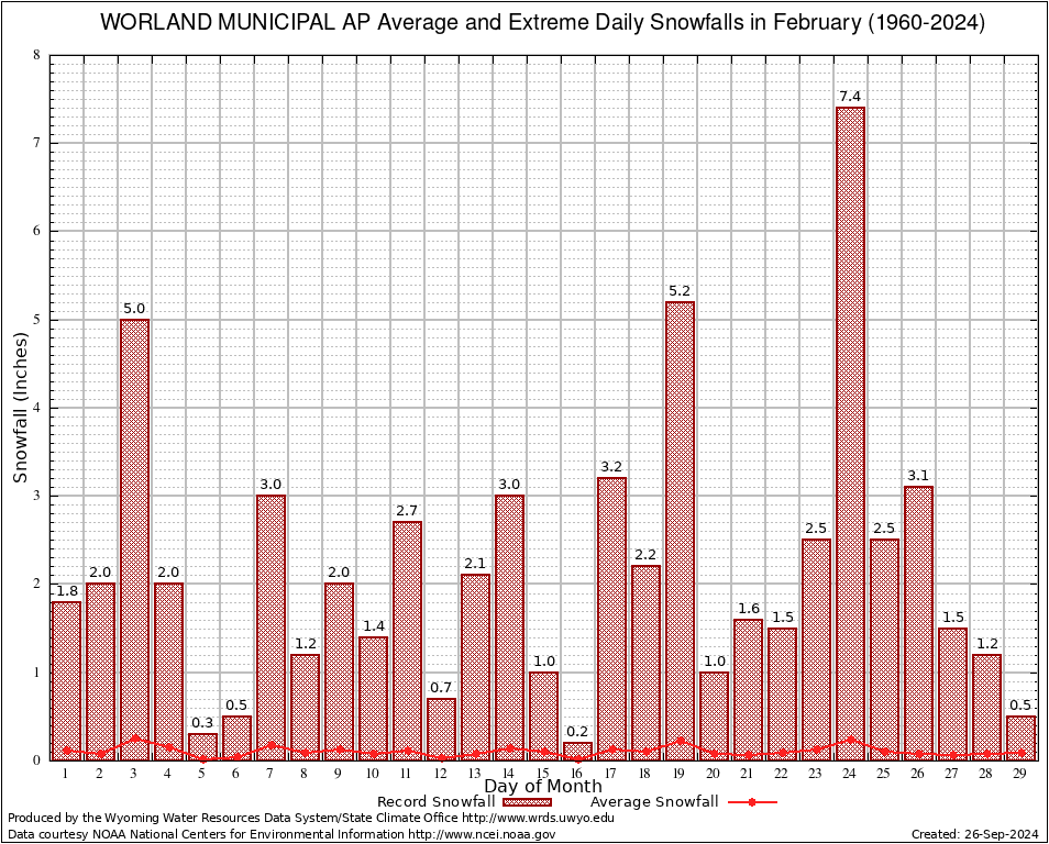 February Average and Extreme Daily Snowfall AMounts (1960-2024)