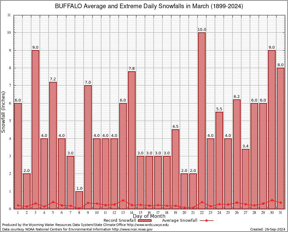 BUFFALO (24066) March Average and Extreme Daily Snowfall AMounts (1899-2024) To index page for BUFFALO