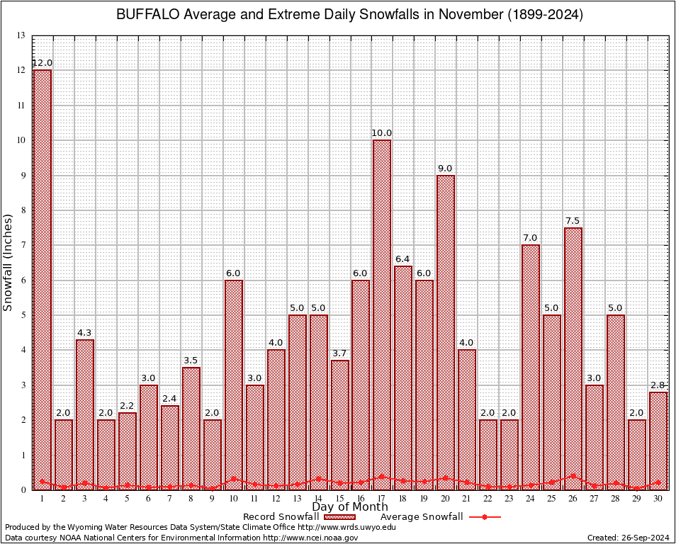 BUFFALO (24066) November Average and Extreme Daily Snowfall AMounts (1899-2024) To index page for BUFFALO