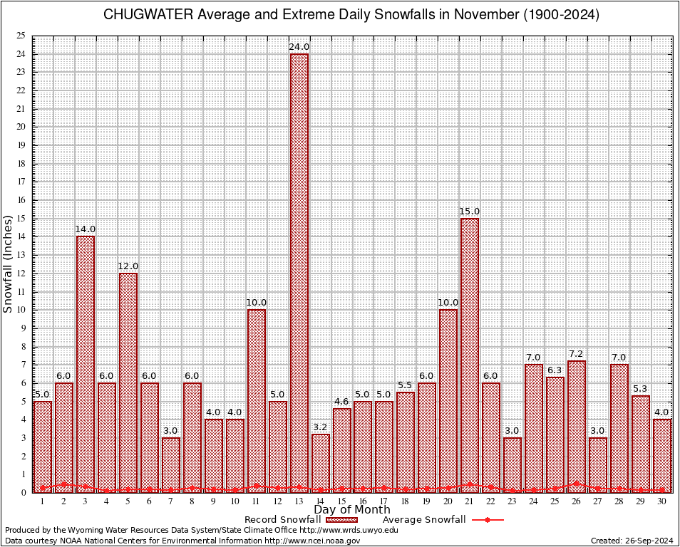 CHUGWATER (24069) November Average and Extreme Daily Snowfall AMounts (1900-2024) To index page for CHUGWATER