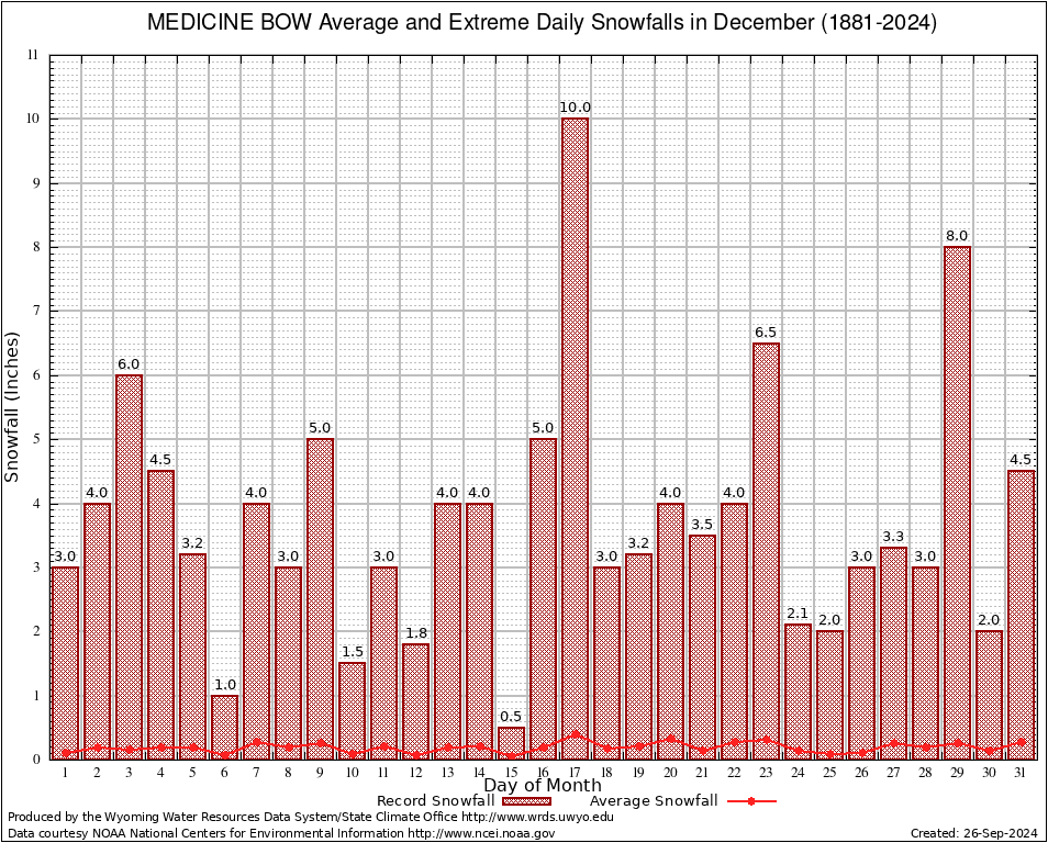 December Average and Extreme Daily Snowfall AMounts (1881-2024)