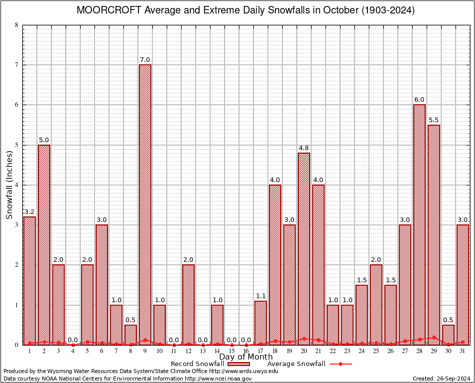 MOORCROFT (24088) October Average and Extreme Daily Snowfall AMounts (1903-2024) To index page for MOORCROFT