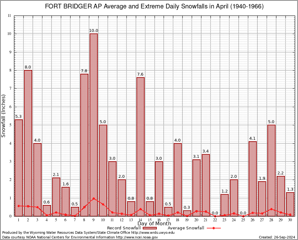 April Average and Extreme Daily Snowfall AMounts (1940-1966)