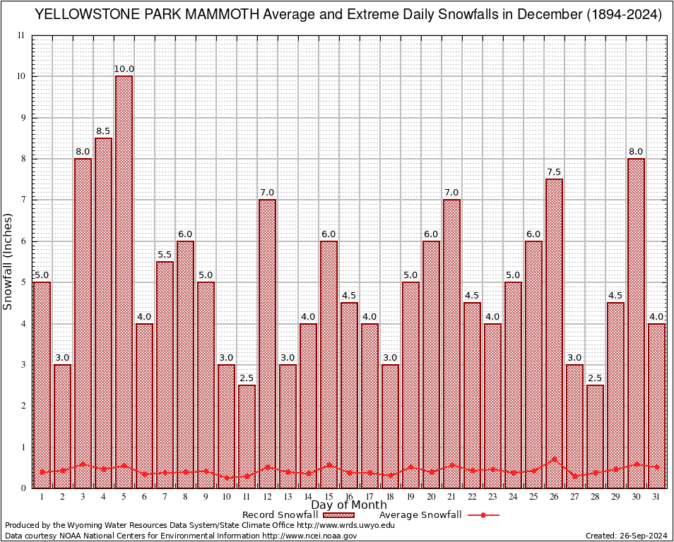 December Average and Extreme Daily Snowfall AMounts (1894-2024)