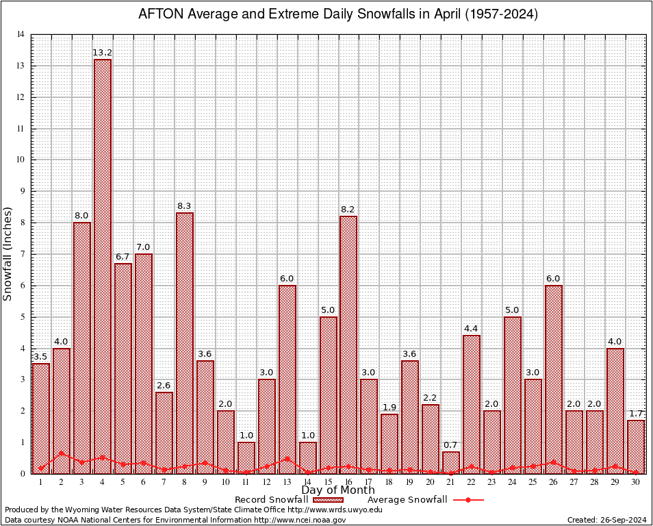 AFTON (480027) April Average and Extreme Daily Snowfall AMounts (1957-2024) To index page for AFTON
