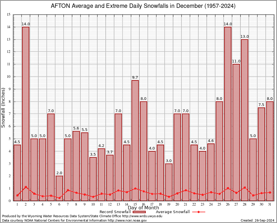AFTON (480027) December Average and Extreme Daily Snowfall AMounts (1957-2024) To index page for AFTON