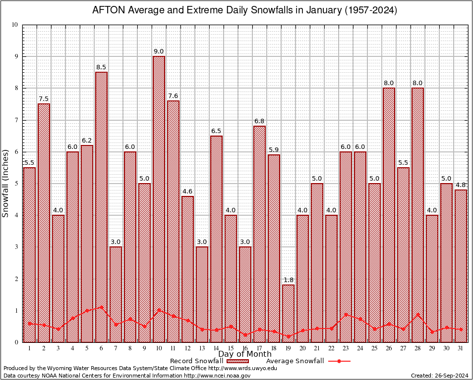 AFTON (480027) January Average and Extreme Daily Snowfall AMounts (1957-2024) To index page for AFTON