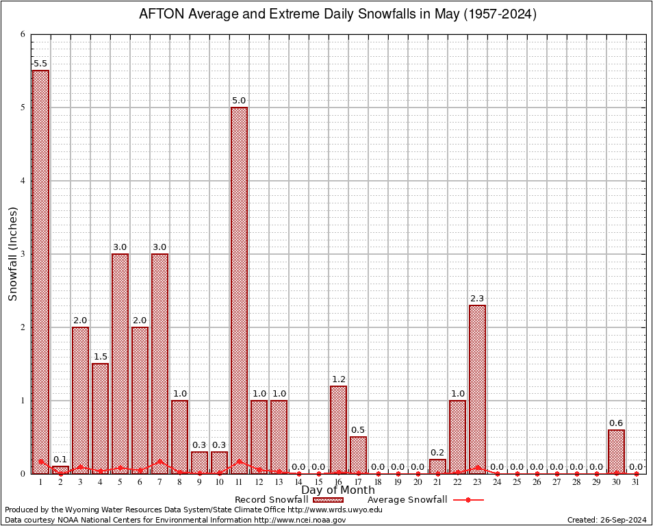 AFTON (480027) May Average and Extreme Daily Snowfall AMounts (1957-2024) To index page for AFTON