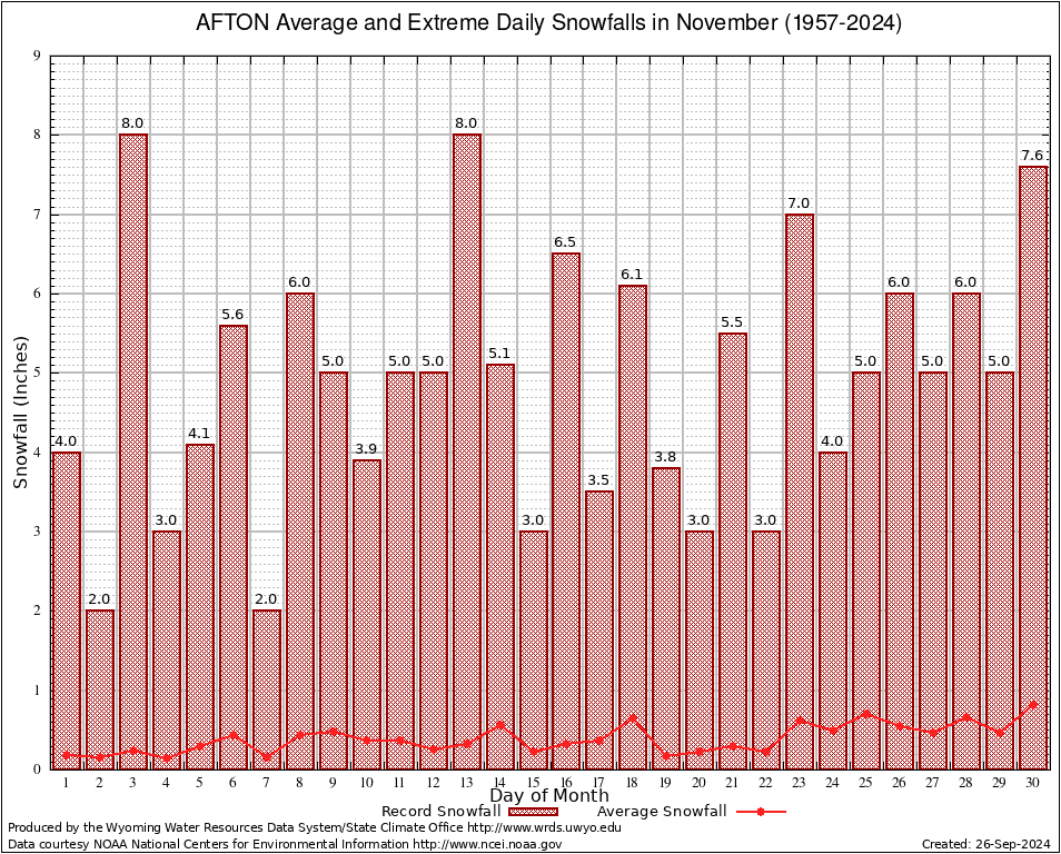 AFTON (480027) November Average and Extreme Daily Snowfall AMounts (1957-2024) To index page for AFTON