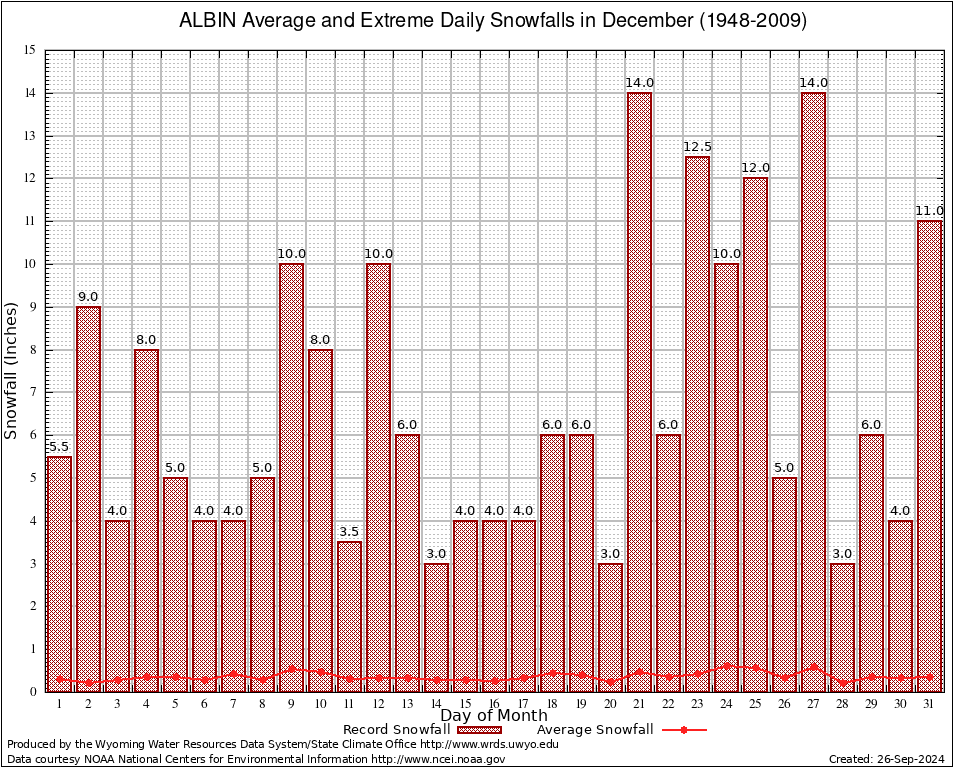 ALBIN (480080) December Average and Extreme Daily Snowfall AMounts (1948-2009) To index page for ALBIN