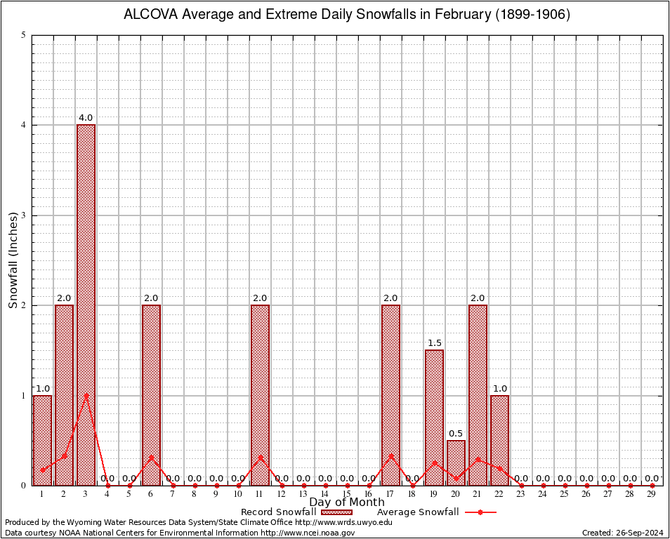 ALCOVA (480090) February Average and Extreme Daily Snowfall AMounts (1899-1906) To index page for ALCOVA