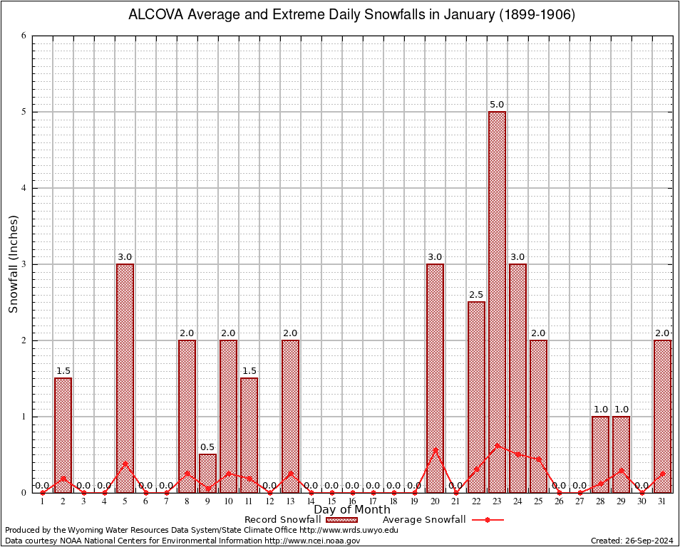 ALCOVA (480090) January Average and Extreme Daily Snowfall AMounts (1899-1906) To index page for ALCOVA