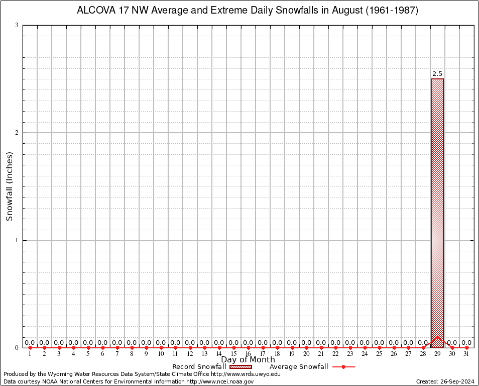 August Average and Extreme Daily Snowfall AMounts (1961-1987)