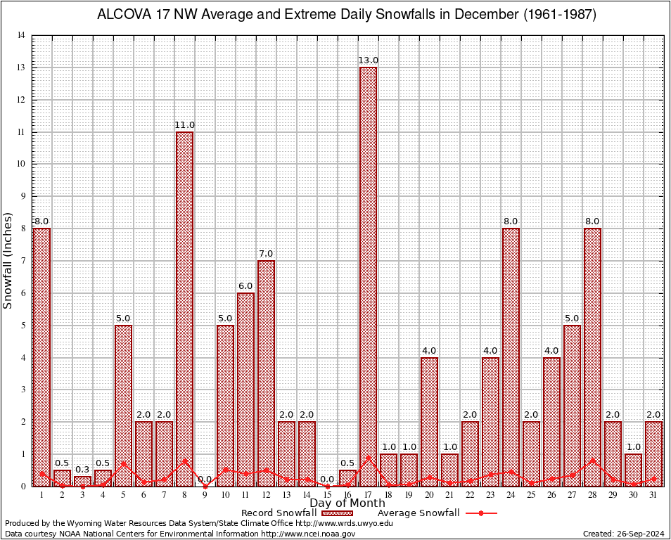 December Average and Extreme Daily Snowfall AMounts (1961-1987)