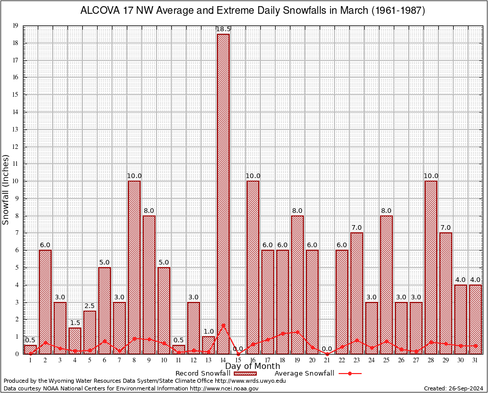 March Average and Extreme Daily Snowfall AMounts (1961-1987)