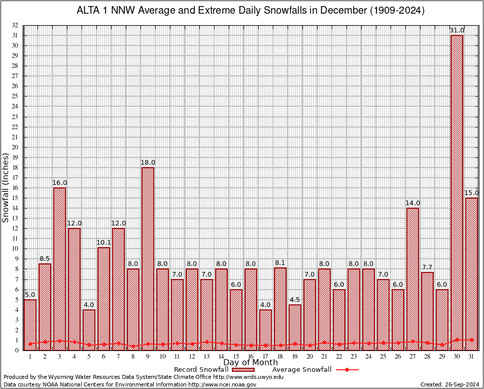ALTA 1 NNW (480140) December Average and Extreme Daily Snowfall AMounts (1909-2024) To index page for ALTA 1 NNW