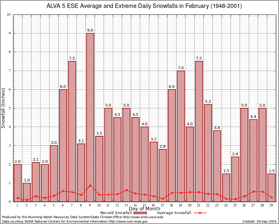 ALVA 5 ESE (480200) February Average and Extreme Daily Snowfall AMounts (1948-2001) To index page for ALVA 5 ESE
