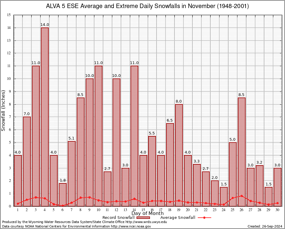ALVA 5 ESE (480200) November Average and Extreme Daily Snowfall AMounts (1948-2001) To index page for ALVA 5 ESE