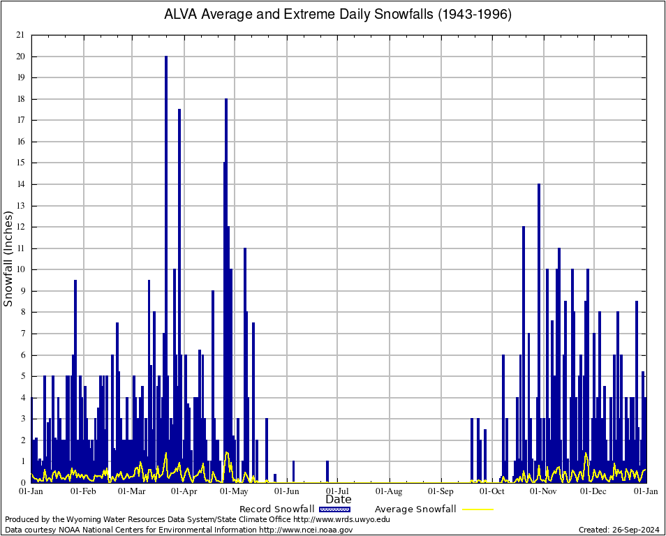 ALVA (480206) Annual Average and Extreme Daily Snowfall AMounts (1943-1996) To index page for ALVA